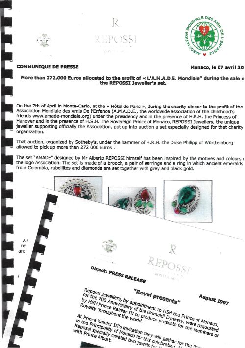 www.amade-mondiale.org) under the presidency and in the presence of H.R.H. the Princess of Hanover and in the presence of H.S.H. The Sovereign Prince of Monaco, REPOSSI Jewellers, the unique jeweller supporting officially the Association, put up into auction a set especially designed for that charity organization. That auction, organized by Sotheby's, under the hammer of H.R.H. the Duke Philipp of Wurttemberg allowed to pick up more than 272.000 Euros.